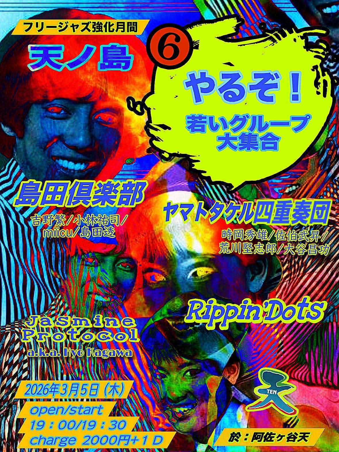 ≪フリージャズ強化月間≫ やるぞ!若いグループ大集合 ▼島田倶楽部 吉野繁/小林祐司/miicu/島田透 ▶Jasmine Protocol [a.k.a. Hyo Kagawa] ▶Rippin' Dots ▼ヤマトタケル四重奏団 時岡秀雄/佐伯武昇/荒川堅志郎/大谷昌功 |