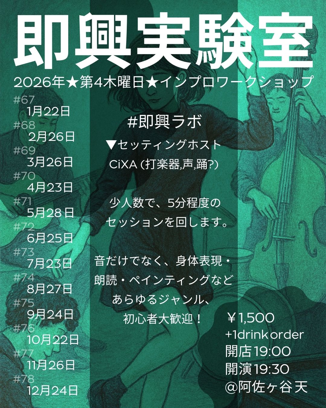 【セッティングホスト】CiXA (打楽器,声,踊?) ★少人数で、5分程度のセッションを回します。 ★音だけでなく身体表現・朗読・ペインティングなどあらゆるジャンル、初心者大歓迎! ※第四木曜日に開催中! |