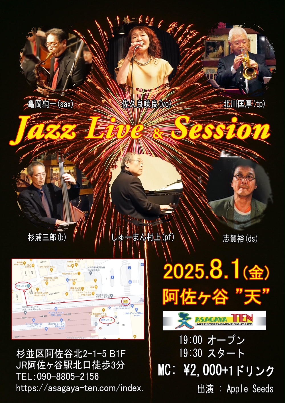 ▼Apple Seeds 亀岡純一(sax) 佐久良咲良(vo) 北川匡厚(tp) 杉浦三郎(b) しゅーまん村上(pf) 志賀裕(ds) |