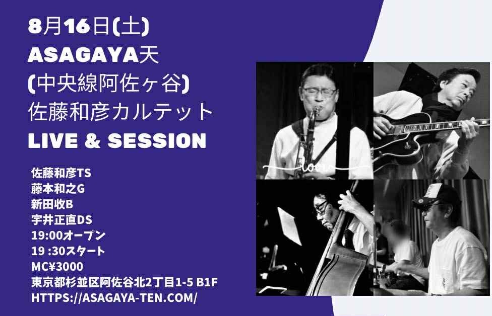 ▼佐藤和彦カルテット 佐藤和彦(ts) 藤本和之(g) 新田收(b) 宇井正直(ds) |