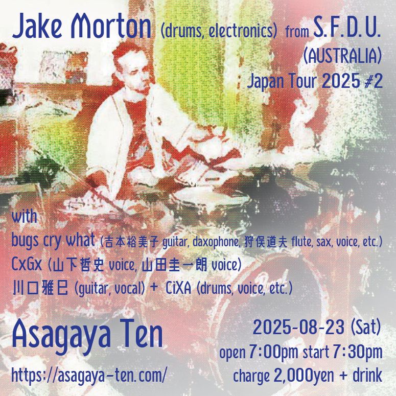 ▼ 川口雅巳(guitar, vocal) CiXA(drums, voice, etc.) ▼CxGx 山下哲史(voice) 山田圭一朗(voice) ▼bugs cry what 吉本裕美子(guitar, daxophone) 狩俣道夫(flute, sax, voice, etc.) ▶Jake Morton from S.F.D.U. (drums, electronics) from オーストラリア |