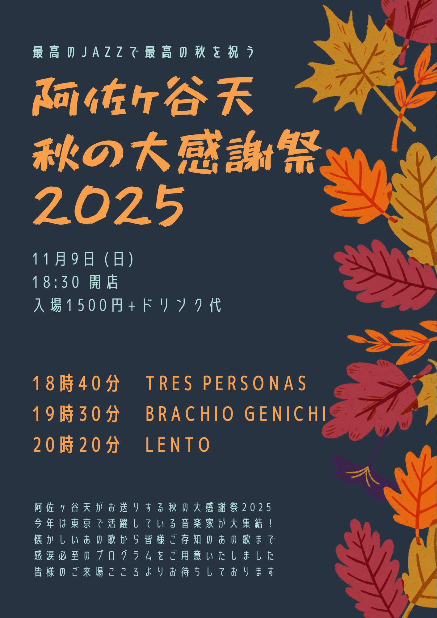 【ライブ&セッションホスト】 ▼楽団四季×神村英男 紀石蒼也(g) 佐藤勝(pf) 田中洋一郎(b) 宮川理(ds) 神村英男(tp,per) ▼knzw band 金澤克彦(key) まちゃ坂本(as) 諸橋志樹(b) 戸塚さや(ds) ▶臼澤茂セッション |