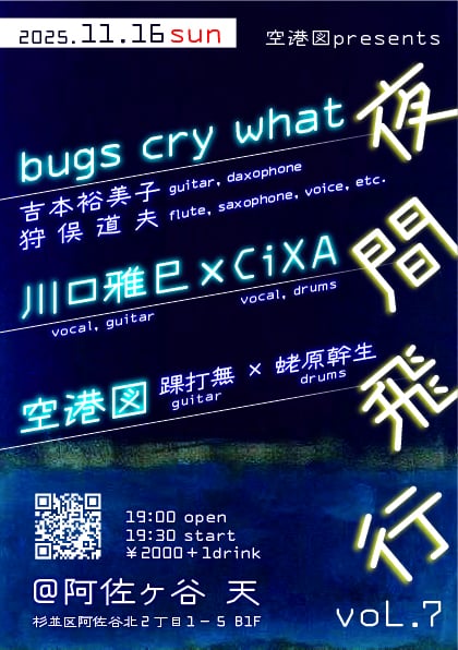 ▼bugs cry what 吉本裕美子 (g, daxophone) 狩俣道夫 (fl, sax, vo, etc.) ▶川口雅巳(vo, g)× CiXA(vo, ds) ▼空港図 踝打無(g)×蛯原幹生(ds) |