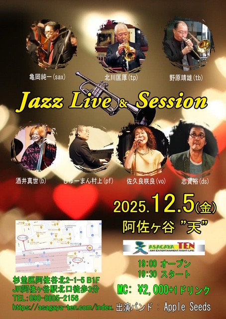 ▼Apple Seeds 亀岡純一(sax) 北川匡厚(tp) 野原靖雄(tb) 酒井真世(b) しゅーまん村上(pf) 佐久良咲良(vo) 志賀裕(ds) |