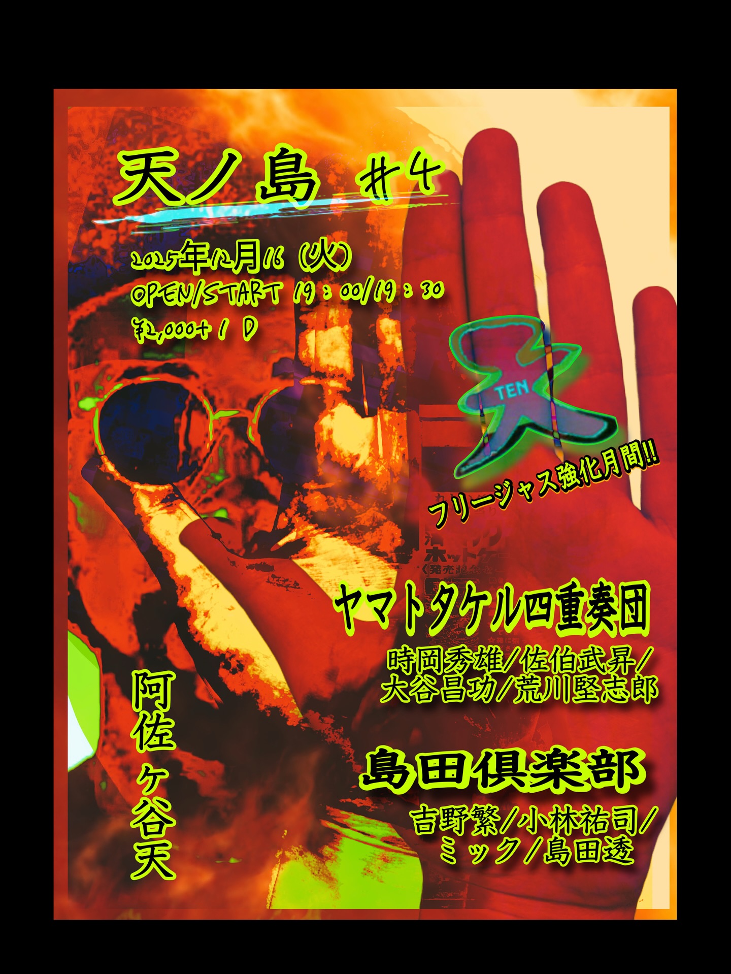 ▼ヤマトタケル四重奏団 時岡秀雄/佐伯武昇/大谷昌功/荒川堅志郎 ▼島田倶楽部 吉野繁(sax) 小林祐司(sax,b-cl) ミック(b) 島田透(ds) |