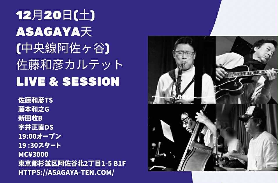 ▼佐藤和彦カルテット 佐藤和彦(ts) 藤本和之(g) 新田收(b) 宇井正直(ds) |