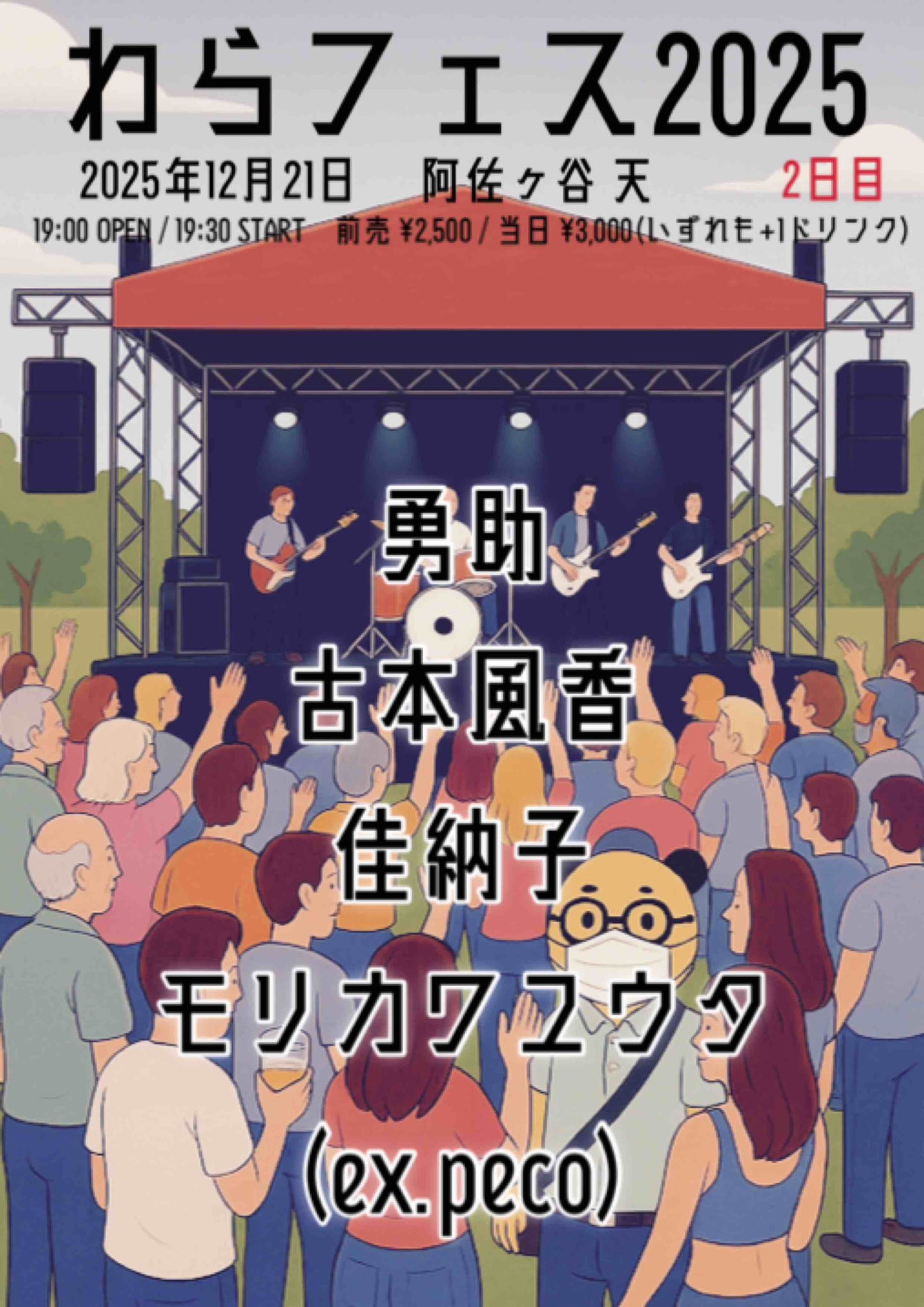 ▶︎勇助 ▶︎古本風香 ▶︎佳納子 ▶︎モリカワユウタ(ex.peco) ※前売 ¥2,500+オーダー |