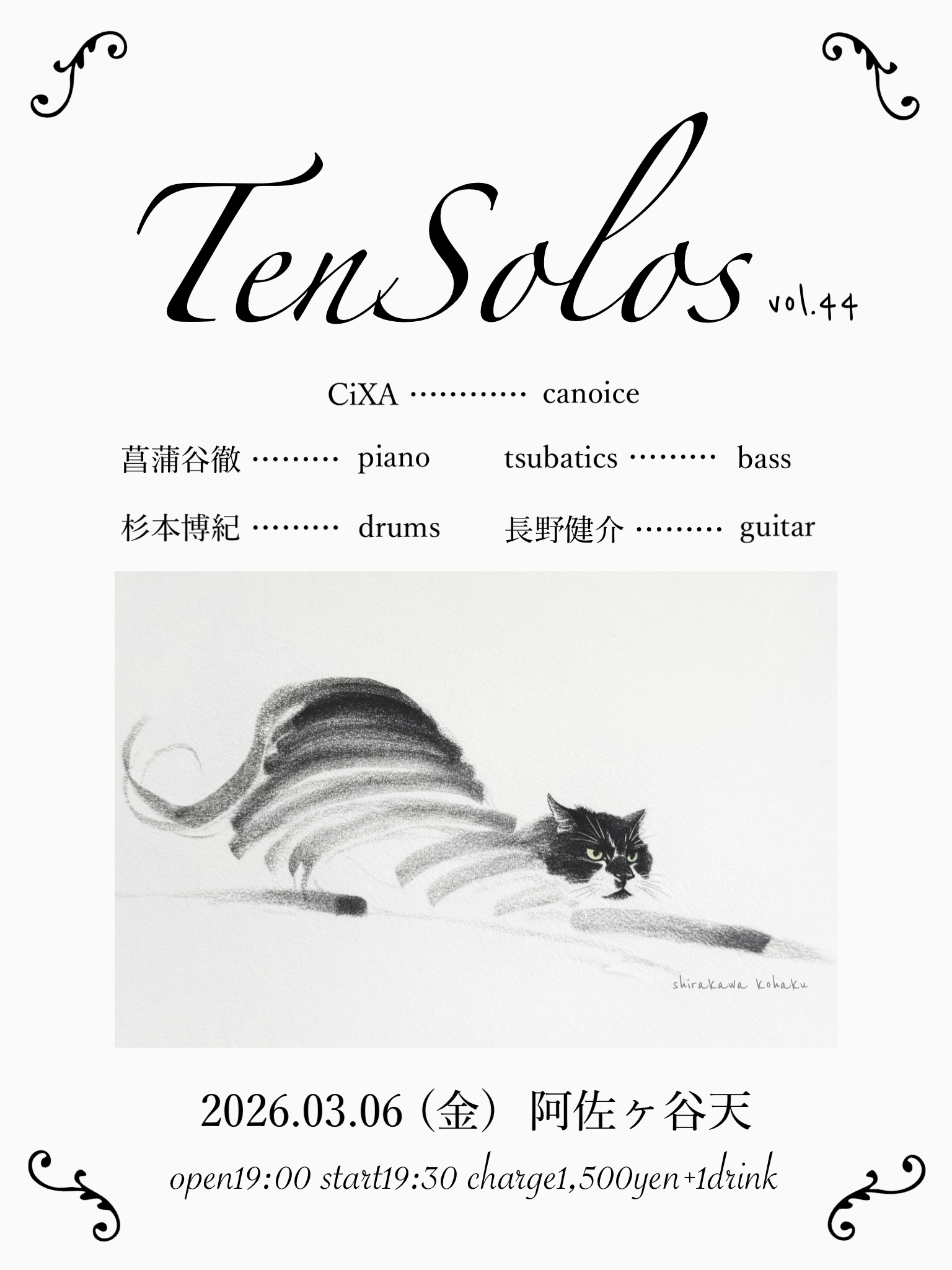 ▶菖蒲谷徹(piano) ▶杉本博紀(drums) ▶長野健介(guitar) ▶CiXA(canoice) ▶tsubatics(bass) |