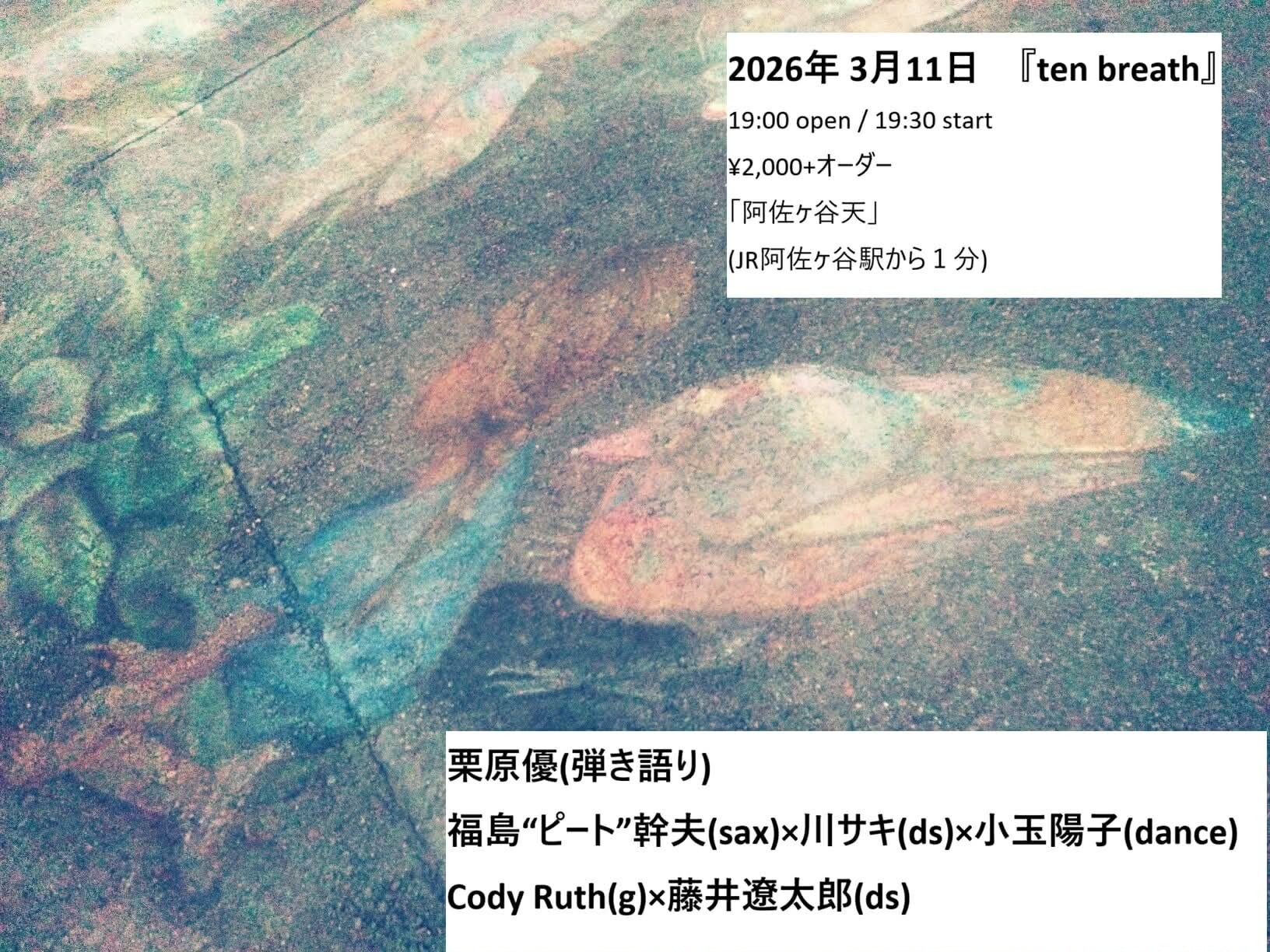 ▶栗原優(弾き語り) ▶福島“ピート”幹夫(sax)×川サキ(ds)×小玉陽子(dance) ▶Cody Ruth(g) ×藤井遼太郎(ds) |