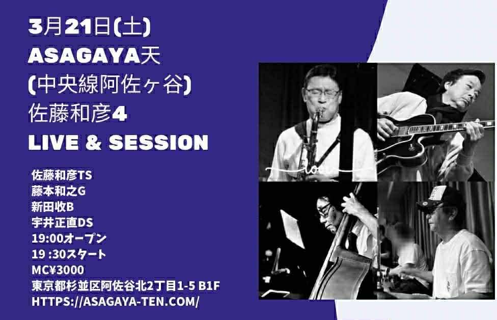 ▼佐藤和彦カルテット 佐藤和彦(ts) 藤本和之(g) 新田收(b) 宇井正直(ds) |