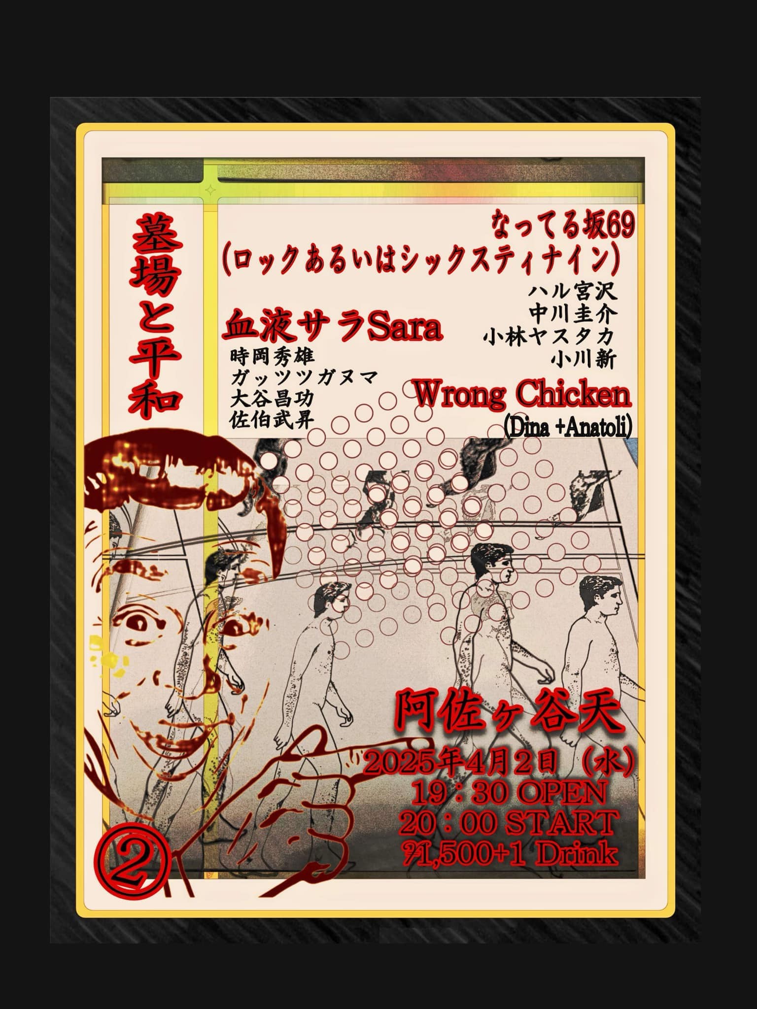 ▼血液サラSara 時岡秀雄(Tsax) ガッツツガヌマ(Tsax) 大谷昌功(dr.reeds) 佐伯武昇(dr.Ahr) ▼なってる坂69(ロックあるいはシックスティナイン) ハル宮沢(g) 中川圭介(b) 小林ヤスタカ(sax) 小川新(ds) ▼Wrong Chicken +Dina / Vox - synth +Anatoli / electronixxxx Drms |