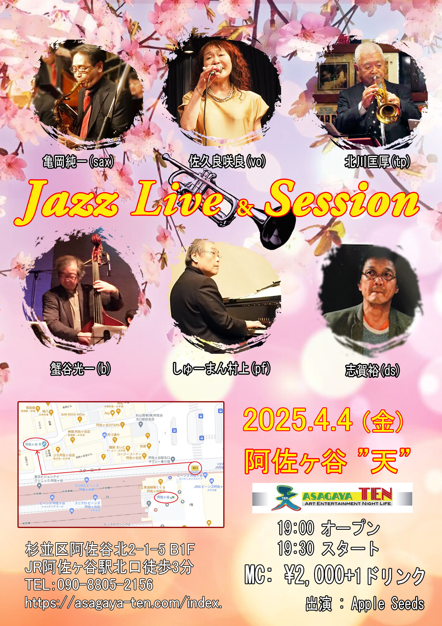 ▼Apple Seeds 亀岡純一(sax) 佐久良咲良(vo) 北川匡厚(tp) 蟹谷光一(b) しゅーまん村上(pf) 志賀裕(ds) |