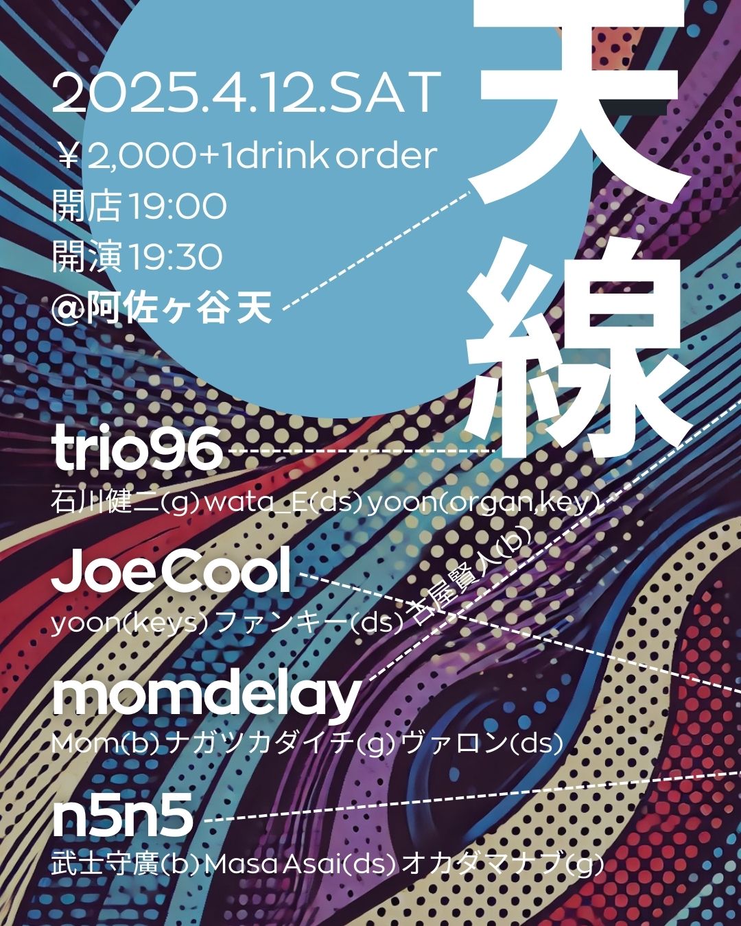 ▼trio96 石川健二(g) wata_E(ds) yoon(organ,key) ▼Joe Cool yoon(keys) ファンキー(ds) 古屋賢人(b) ▼momdelay Mom(b) ナガツカダイチ(g) ヴァロン(ds) ▼n5n5 武士守廣(b) Masa Asai(ds) オカダマナブ(g) |