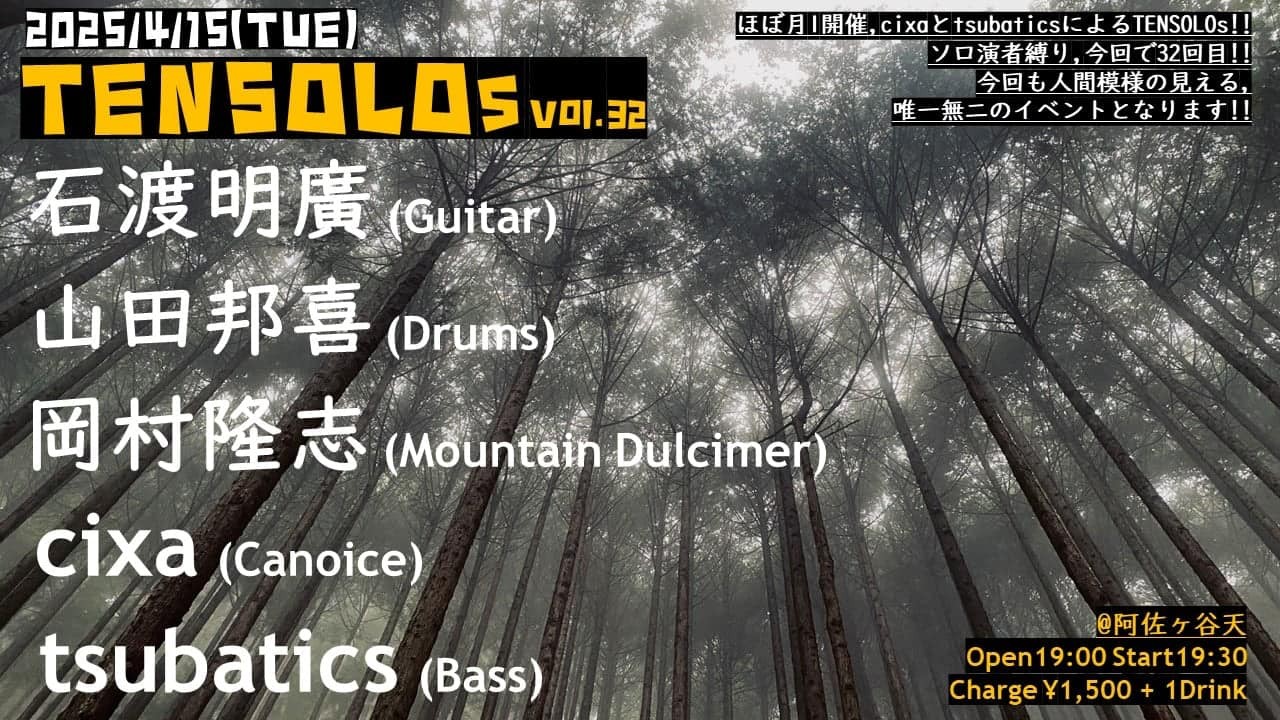 ▶石渡明廣(g) ▶︎tsubatics(b) ▶cixa(canoice) ▶Kuniyoshi Yamada(ds) ▶岡村隆志(mountain dulcimer) |