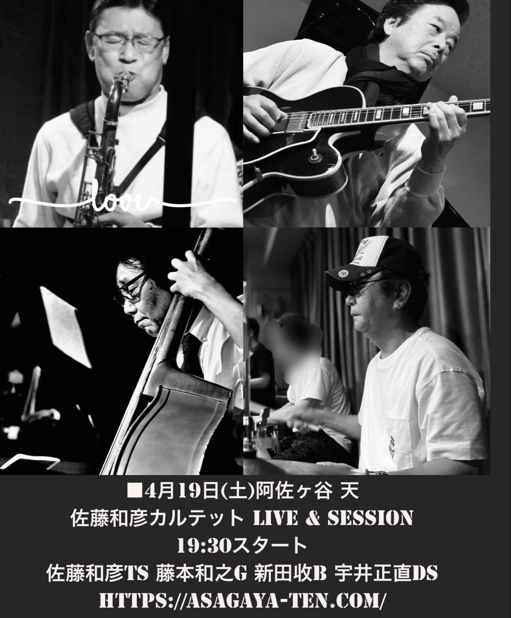 ▼佐藤和彦カルテット 佐藤和彦(ts) 藤本和之(g) 新田收(b) 宇井正直(ds) |