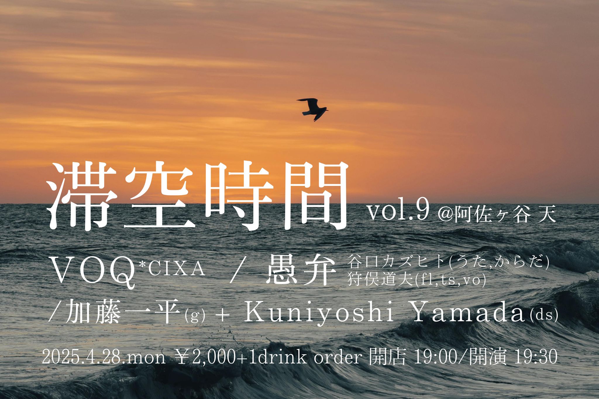 ▶VOQ *cixa ▶加藤一平(g) + Kuniyoshi Yamada(ds) ▼愚弁 谷口カズヒト(うた,からだ) 狩俣道夫(fl,ts,vo) |