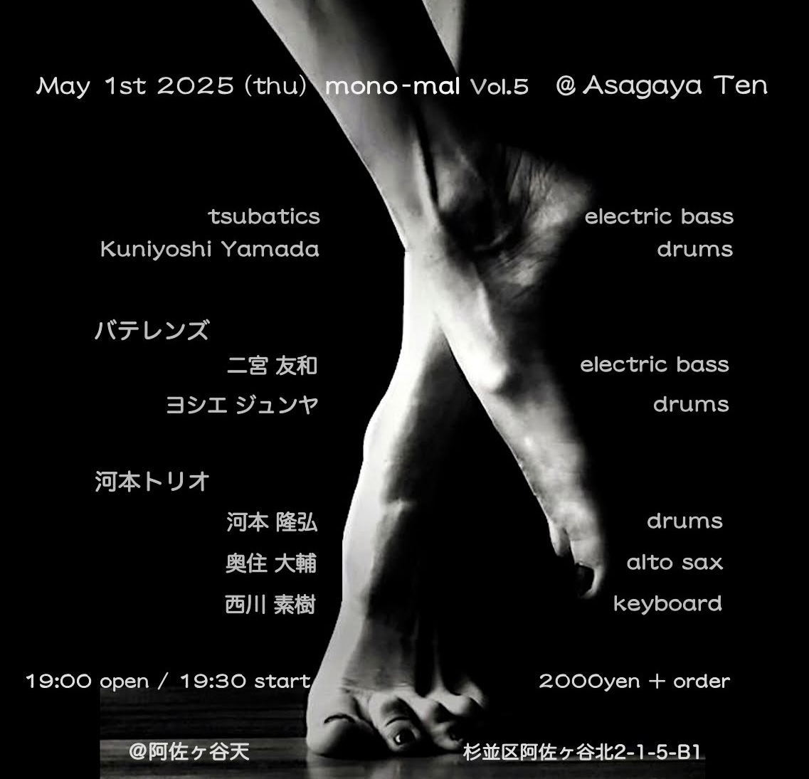 ▶山田邦喜(ds)×tsubatics(b) ▼バテレンズ 二宮友和(b) ヨシエジュンヤ(ds) ▼河本トリオ 河本隆弘(ds) 奥住大輔(as) 西川素樹(key) |