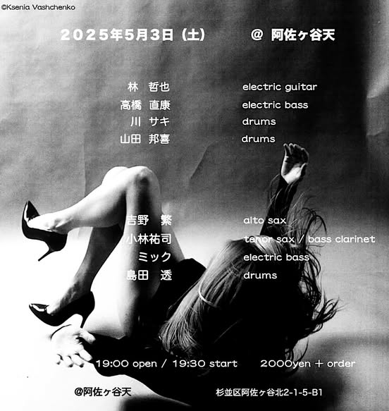 ▼ 林 哲也(electric guitar) + 高橋 直康(electric bass) + 川サキ(drums) + Kuniyoshi Yamada(drums) ▼ 吉野繁(alto sax) + 小林祐司(tenor sax, bass clarinet) + ミック(electric bass) + 島田透(drums) |