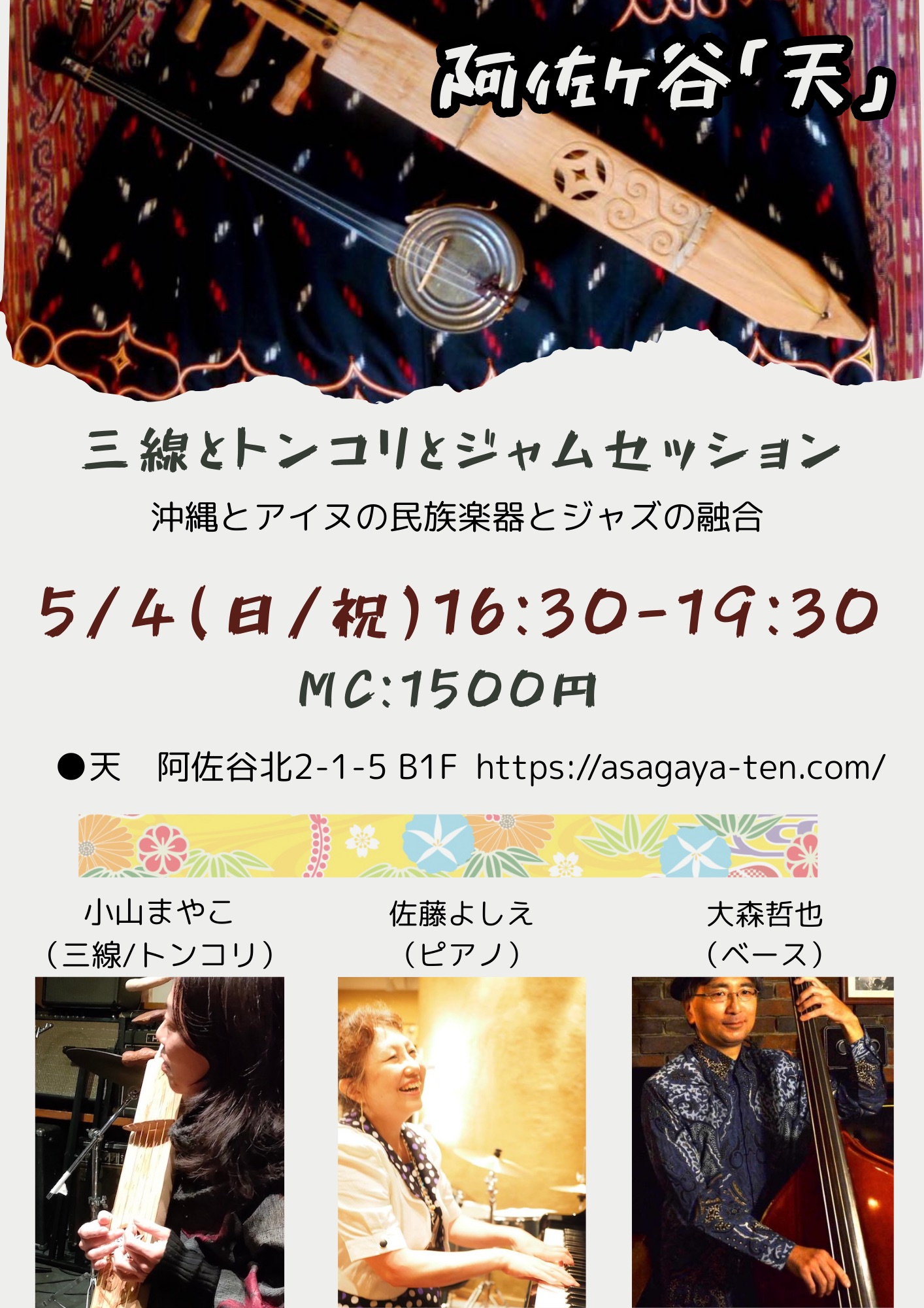 【ホスト】 小山まやこ(三線,トンコリ) 佐藤よしえ(pf) 大森哲也(b) |