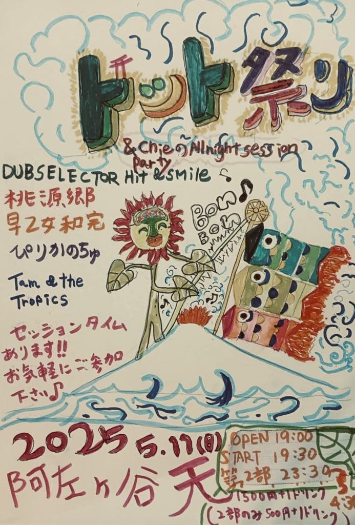 第①部:19:00~ ▶桃源郷 ▶早乙女和完 ▶ぴりかのちゅ ▶Tam & The Tropics DJ:今 第②部:23:30~翌4:30 Free Session ※②部のみの方は¥500+1drinkオーダー |