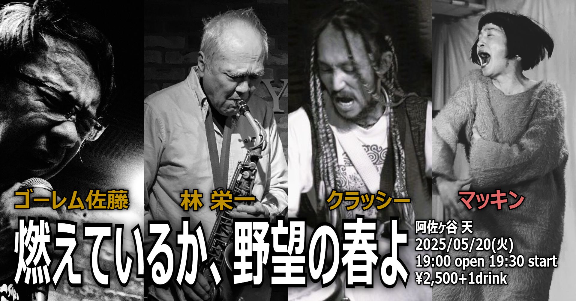 ▼ 林栄一(A.Sax) クラッシー(Perc) マッキン(Dance,Vo) ゴーレム佐藤(Scr) ■第二部は飛入り・セッション! どなたも参加してください! 楽器でも声でも踊りでも! |