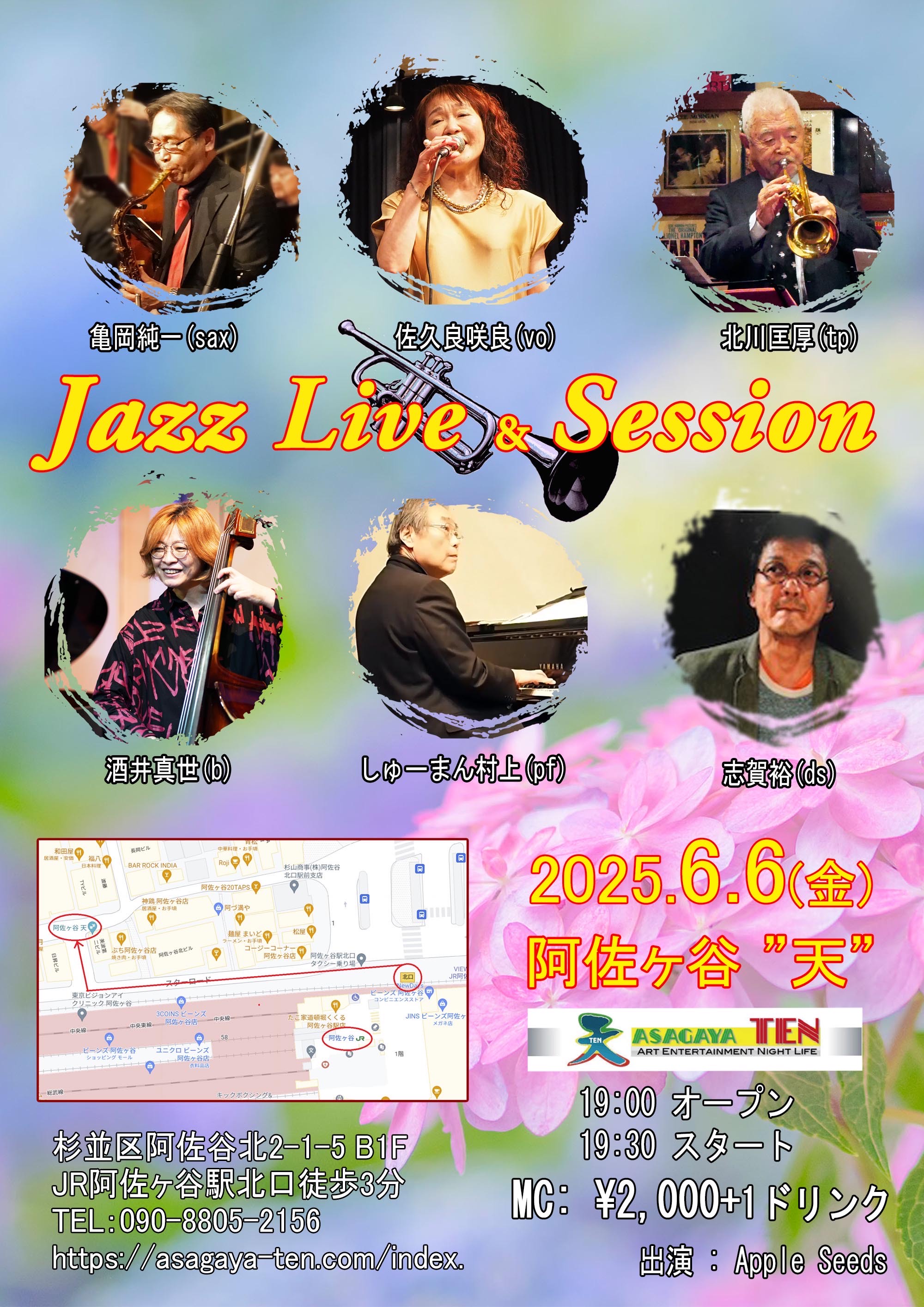 ▼Apple Seeds 亀岡純一(sax) 佐久良咲良(vo) 北川匡厚(tp) 酒井真世(b) しゅーまん村上(pf) 志賀裕(ds) |