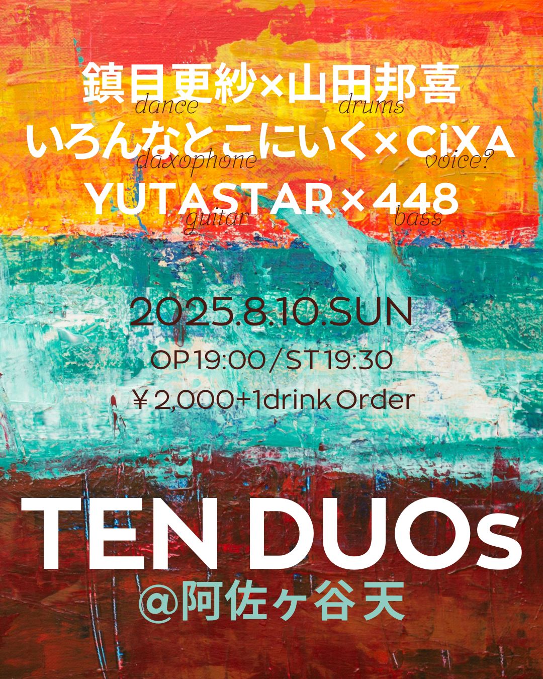 ▶鎮目更紗(dance)×山田邦喜(ds) ▶いろんなとこにいく(daxo)× CiXA(vo?) ▶YUTASTAR(g)×448(b) |