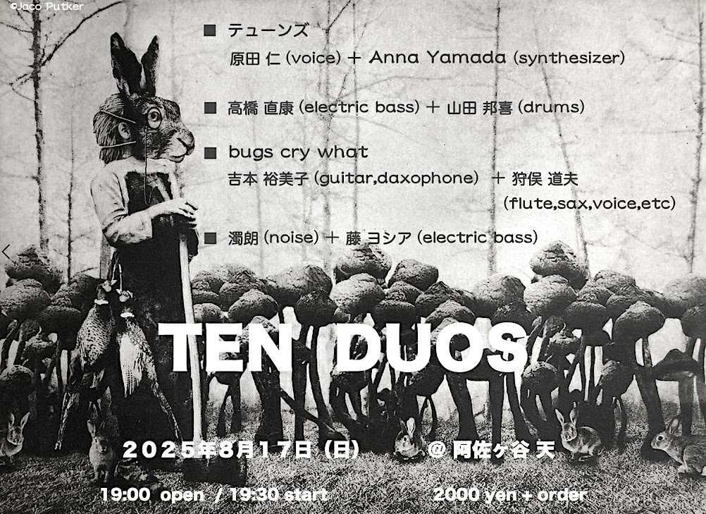 ▼ 高橋 直康(electric bass) Kuniyoshi Yamada(drums) ▼テューンズ 原田 仁(voice) Anna Yamada(synthesizer) ▼bugs cry what 吉本裕美子(guitar,daxophone) 狩俣 道夫(flute,sax,voice,etc) ▼ 濁朗(noise) 藤ヨシア(electric bass) |