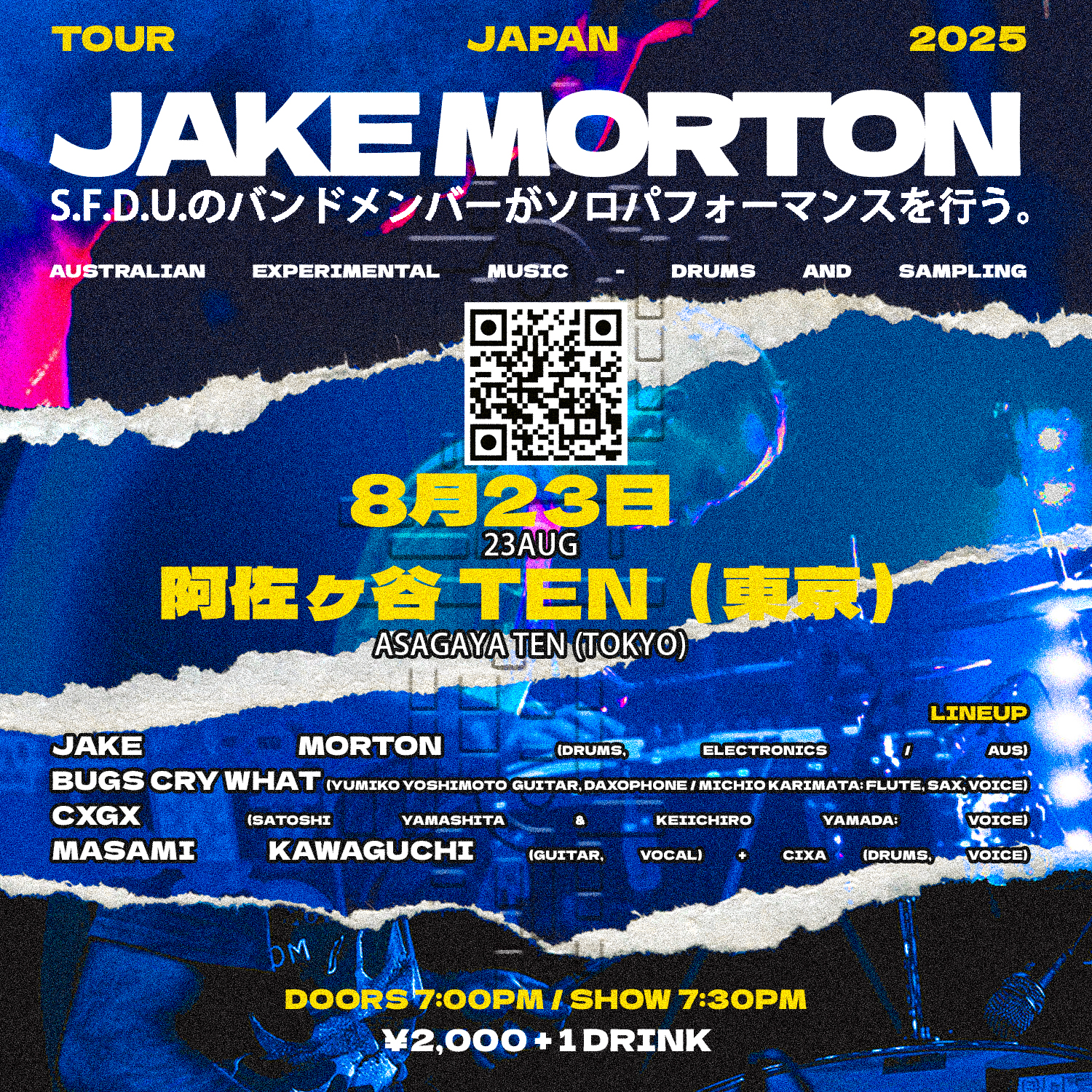 ▼ 川口雅巳(guitar, vocal) CiXA(drums, voice, etc.) ▼CxGx 山下哲史(voice) 山田圭一朗(voice) ▼bugs cry what 吉本裕美子(guitar, daxophone) 狩俣道夫(flute, sax, voice, etc.) ▶Jake Morton from S.F.D.U. (drums, electronics) from オーストラリア |