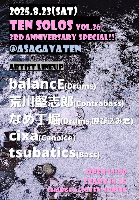 ▶balancE (drums) ▶荒川堅志郎(contrabass) ▶CiXA(canoice) ▶tsubatics(bass) OA:なめ丁堀(drums,呼び込み君,G-vo) |
