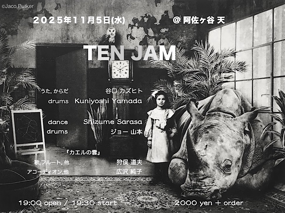 ▼ 谷口カズヒト(うた,からだ) + Kuniyoshi Yamada(drums) ▼ 鎮目更紗(dance) + ジョー山本(drums) ▼カエルの雲 狩俣道夫(歌,フルート,他) + 広沢純子(アコーディオン,他) |