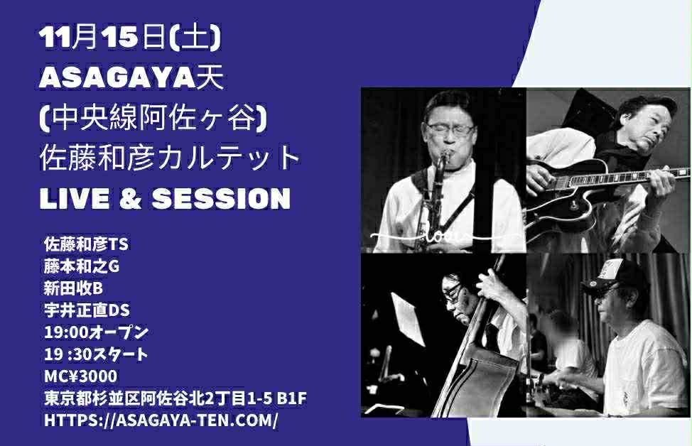 ▼佐藤和彦カルテット 佐藤和彦(ts) 藤本和之(g) 新田收(b) 宇井正直(ds) |