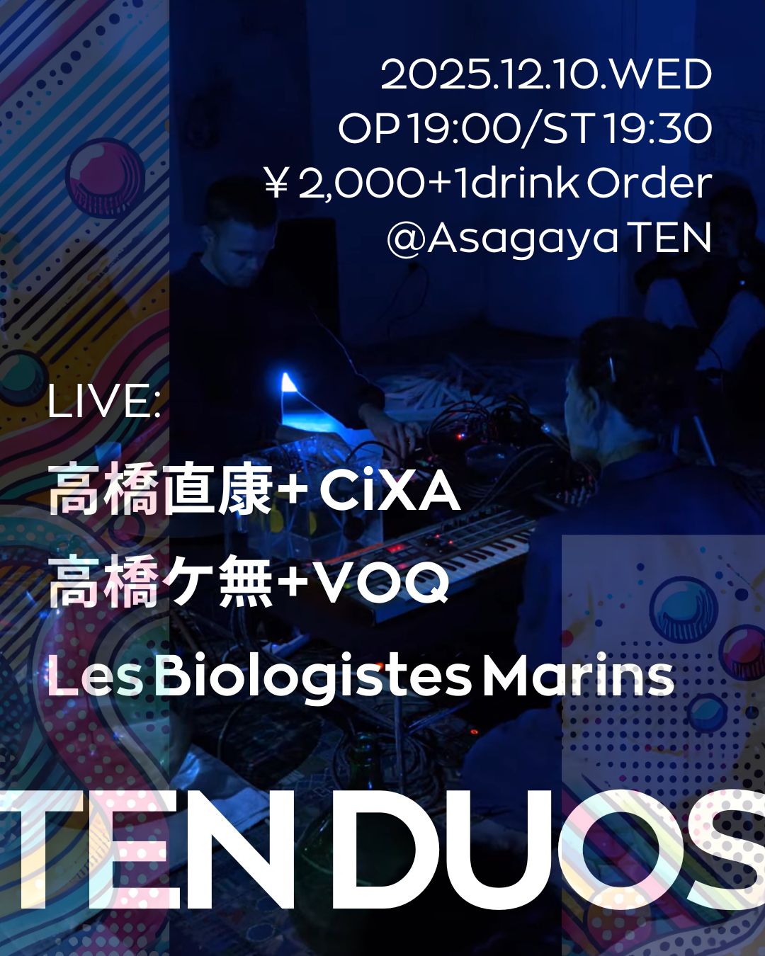 ▶高橋直康(bass)+ CiXA(踊?) ▶高橋ケ無+VOQ ▶Les Biologistes Marins (duo) ※山田邦喜は都合により出演キャンセルとなりました |