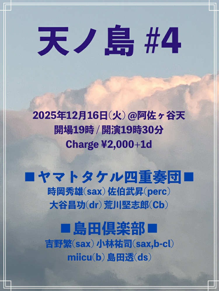 ▼ヤマトタケル四重奏団 時岡秀雄/佐伯武昇/大谷昌功/荒川堅志郎 ▼島田倶楽部 吉野繁(sax) 小林祐司(sax,b-cl) ミック(b) 島田透(ds) |